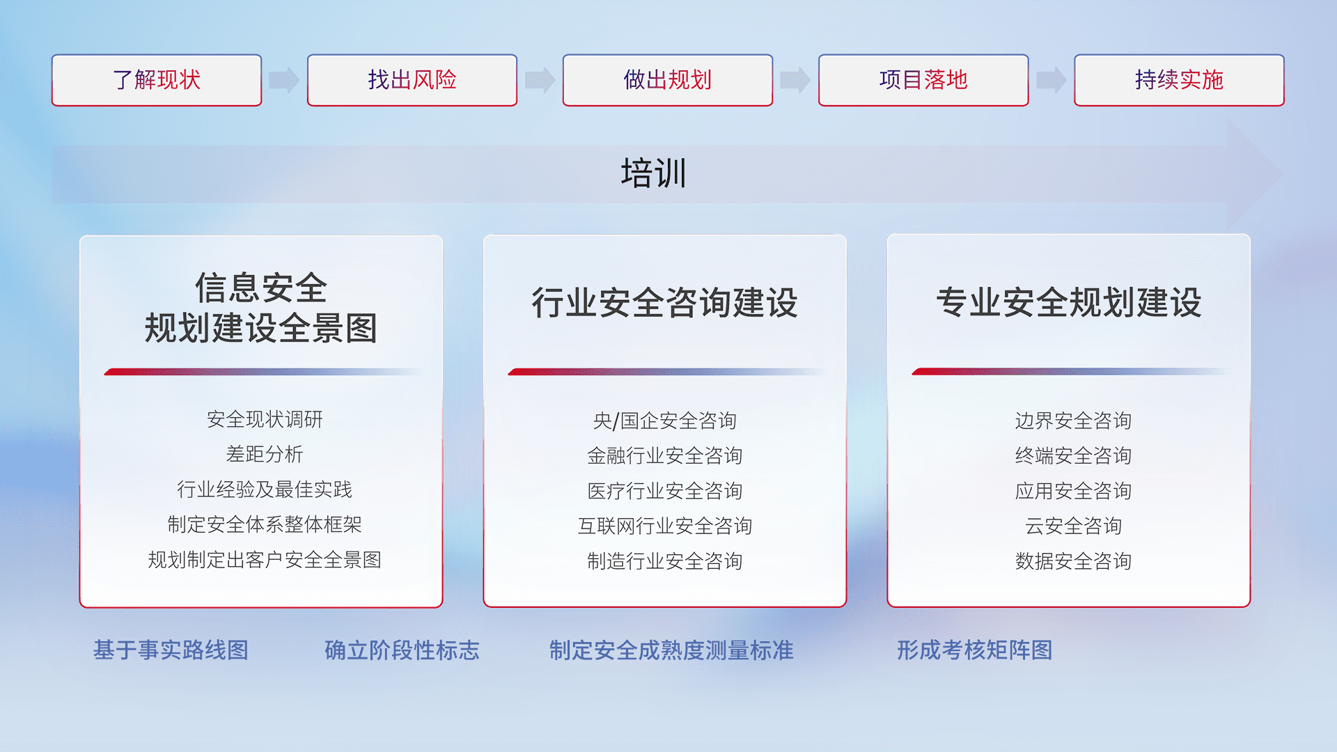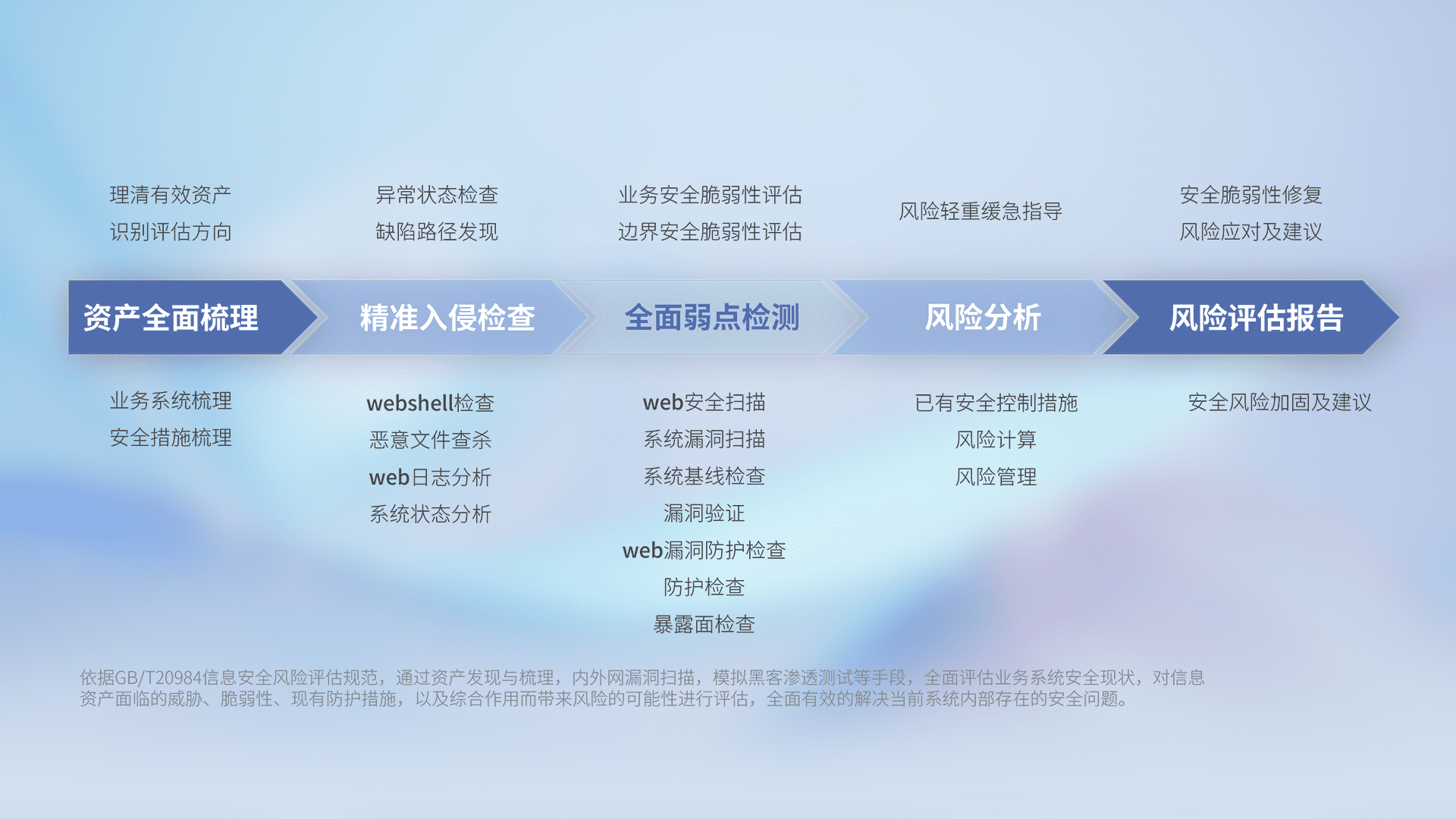 针对客户行业特性,,,以专业的安全服务+多厂商联合解决方案提供专属的一站式安全管理服务,,,帮助客户全面感知网络空间威胁,,基于识别、、、、检测、、分析、、防护、、监测、、、、响应的服务理论模型,,从方案咨询、、、、集成交付、、、、评估验证、、、优化加固、、、、运维运营,,致力于为客户提供完整的闭环管理式安全服务。。。以实战经验为客户打造高抵御风险的安全体系,,,,帮助客户发现威胁、、、对抗威胁、、、处置威胁,,,不断积累安全对抗能力,,,,持续保障数字化安全。。。。