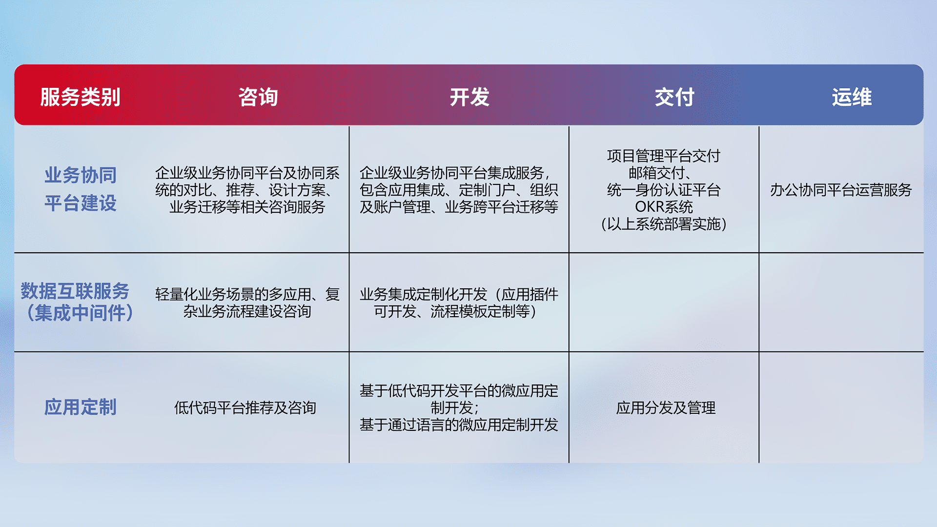 针对钉钉、、企微、、IDaas等平台级产品提供产品的规划、、、、方案、、、、交付、、定制化开发等服务,,实现如统一协同办公、、、智能客户服务、、混合会议管理、、、、智能数据查询、、、等业务场景,,实现数字化转型。。。。